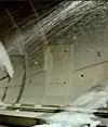 Skjermdump fra video under byggeperioden. Stort trykk utenfra fører til at vannt renger seg gjennom betong-liningen og vannspruten står inn i tunnelen. Innsyn fra Oslo tingrett