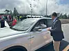 Første bilist etter offisiell åpning av riksvei 4 på Lygna var Patrik Hammerås fra Oslo. Han ble overrasket med en blomsterbukett fra statssekretær Tom Kalsås i samferdselsdepartementet.