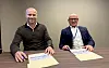 Robert Skjervstad, daglig leder i Trym Anlegg (t.v) og prosjektdirektør i Bane NOR, Per Vilnes, signerte den første kontrakten for kapasitetsøkende tiltak på Trønderbanen.