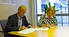 Konsernsjef i Avinor Dag Falk-Petersen og direktør for Skatt øst, Ann Kjersti Kjeia Sletten signerer avtalen.