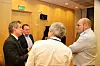 Advokat Morten Goller (t.v.) i samtale med blant andre Steinar Myhre i Skanska (t.h.) i en pause i Follobane-rettssaken.