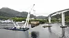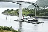 Her ser vi anlegget der det bygges skipsbarriere på den midterste brupilaren på Måløybrua. Den ombygde bilferja Flekkerøy fra selskapet Samba Marin har jobben med å sikre tilkomst for anleggsmaskiner til det vanskelig tilgjengelige anleggsområdet midt i sundet.