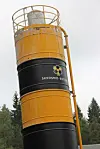 Den oransje og svarte profilen til Skedsmo-firmaet preger nå den ruvende betongsiloen, som er et «landemerke» på Huken. Da Byggeindustrien nylig besøkte anlegget, var malingen såvidt tørr etter omprofilering med nye farger og ny logo.