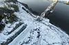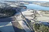 Her vises både motorvei og veikryss på Steinkjer-siden av Beitstadsundet, med bru, tunnel og vei på andre siden av sundet helt oppe i bildet. Foto: Trøndelag fylkeskommune
