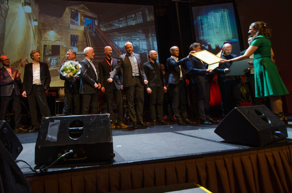 Nominerte til (og vinnere av) Årets trebyggeri 2016 for Moholt 50|50, Sigbjørn Faanes (fra venstre), Lisbeth Aspås, Helge Lunder, Bjørn Arve Snekvik, Minna Riska, Dagfinn Sagen og Lars Erik Borge.