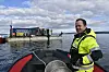 Anleggsdykker Robert Riseberg sitter i beredskap med dykkerutstyr på. Han er klar for å hjelpe dykkeren i vannet når som helst hvis han trenger hjelp.