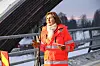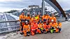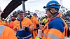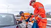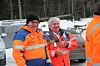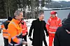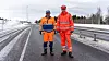 Konserndirektør anlegg Steinar Myhre i Skanska Norge og delprosjektleder Pål Steinar Karlsen i Statens vegvesen deler ut gaver til de første bilistene som kjørte på veien i helgen. Foto: Mikkel Walle/Skanska