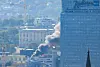 Oslo 20230612. Slokkearbeidet pågår fortsatt i kontorbygningen i krysset Grensen - Akersgata, Grensen 17, i Oslo. Brannen skal ha startet på takterrassen i den åtte etasjer høye kontorbygningen.Foto: Cornelius Poppe / NTB