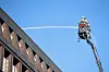 Brannvesenet jobber med å slukke brann på takterrasse i Oslo sentrum. Foto: Frederik Ringnes / NTB