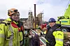 Rune Fagerheim (t.v.) og prosjektleder Jan Atle Einerkjær foran forskalingsløsningen de var med på å utvikle for Moldhaugbrua i Porsgrunn.