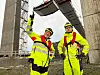 Magne Ramlo, Nye Veiers prosjektsjef for E18 Rugtvedt-Langangen (t.v), peker opp på det siste elementet som ble heist på plass på Grenlandsbrua mandag. Her sammen med byggeleder Marius Normann. Foto: Ådne Homleid