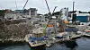 Klatrestøpingen av brutårnet på Knarrevik i Øygarden kommune er i gang, og utover våren vil også entreprenøren starte støpingen av brutårnet på Drotningsvik-siden. Etter planen skal de 145 meter høye betongkonstruksjonene være ferdig om cirka ett år. Det er det spanske selskapet Tecozam som har kontrakten for betongarbeidene ved den nye Sotrabrua. Dronefoto: Sotra Link.