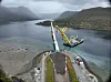 Mandag 22. september ble det mulig for arbeidere med sikringstau å gå tørrskodd over fjorden. Klokken 12 ble det siste stålelementet til Ramfjordbrua lirket på plass mellom søylen i sjøen og landkartet ved Leirbakken. Foto: Statens vegvesen