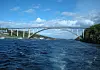 Knarrlagsund bru ligger på fylkesvei 6448 i Hitra kommune. Nå skal den gamle brua erstattes med en ny. Foto: Wikipedia