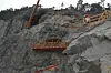 Mannskapa driv sikring frå ein arbeidsplattform som heng inn mot fjellveggen. Ein byggjekran som står på veganlegget i tunnelmunninga held plattformen på plass medan sikringsarbeidet pågår.