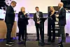 Programleder Christian Aarhus, statsminister Erna Solberg, administererende direktør i Repstad Anlegg og styreleder i MEF, Arnstein Repstad og administrerende direktør Julie Brodtkorb i MEF og programleder Frode Aga.