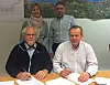 Foran f.v: Prosjektsjef Knut Edmund Knutsen i Jernbanverket og Prosjektdirektør Jan Erik Skogen signerer sluttavtalen. Bak fv: Prosjektdirektør Stine Ilebrekke Undrum i Jernbaneverket og Regiondirektør Trond Valeur i Skanska. (Foto: Jernbaneverket)