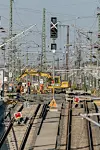 Leipzig er ett av de såkalte knutepunktene på den nye jernbanestrekningen, og det er utført omfattende utbygging og modernisering av denne og de øvrige knutepunktstasjonene. Til venstre i bildet sees Leipzig sentrum med de to karakteristiske høyhusene nær jernbanestasjonen. Foto: DB Netz/Hannes Frank