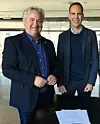 Driftskontrakten ble nylig signert av regionsdirektør for Statens vegvesen Sør, Kjell Inge Davik (til venstre) og direktør Anders Høvik i NCC Road Services.Foto: NCC