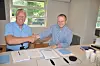 Daglig leder i Marthinsen og Duvholt AS, Frank Duvholt (til venstre) signerte kontrakten med prosjektleder Tom Hedalen i Statens vegvesen.Foto: Kjell Wold
