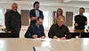 Prosjektsjef Mario Perissutti (sittende til venstre) fra PNC og prosjektdirektør Svein Røed i undertegnet 15. februar kontrakt om bygging av ny E16 mellom Eggemoen og Åsbygda. Signeringen ble overvåket av Stig Kjetil Methi (bak fra venstre) fra Statens vegvesen, Mariusz Urbanski, prosjektleder i PNC, Bettina Gerti Gros fra PNC og Åge Brudeseth fra Statens vegvesen.