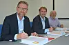 F.v. salsdir. Tor-Ove Lussand i ABB AS, regionvegsjef Helge Eidsnes i Statens vegvesen og styremedlem Magnus Thunestvedt signerer kontrakten.