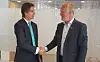 Sverker Åkerblom (t.v.) , direktør i BlackRock og Tore Voster, markedssjef i Stangeland Maskin markerte avtalen med et godt håndtrykk etter å ha signert kontrakten på Guleslettene vindpark. Et fond forvaltet av BlackRock, verdens største kapitalforvalter og ledende investor i fornybar energi, har kjøpt Guleslettene vindpark av Zephyr, slik de gjorde med Tellenes vindpark.