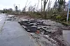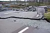 Lastebiler og trær i veikanten, og sammenkrøllet, forskjøvet vei med asfaltbiter på, er også konsekvenser av jordskredets krefter.