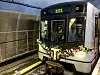 Den første T-banen til nye Løren stasjon i Oslo. Pyntet med blomster og skiltet "101" for å symbolisere at Løren stasjon blir Oslos 101. stasjon.