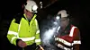 Tidligere Haram-ordfører Oddbjørn Vatne (t.v) fikk æren av å fyre av salva som sørget for gjennomslag i Haramsfjordtunnelen. Bas Geir Olsen i Skanska følger nøye med.