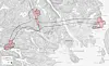 Illustrasjon med planavgrensning. Store deler av strekningen vil ligge i tunnel. De røde sonene i kartet viser områder der det vil kunne skje tiltak over bakken. Ill. Nye Veier