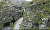 E45 Kløfta er en flaskehals for tungtrafikken og vegen stenges ofte av ras, særlig vinterstid. Dagens veg ligger langs en elv i en canyon med bratte, ustabile og rasfarlige fjellsider. Dronefoto: Erik Larsstuen / Statens vegvesen