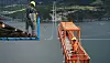 Mannskap og reidskap blir frakta mellom brutårn og byggjeplassane ute i spennet med ei korg som køyrer på taubana over fjordspennet.