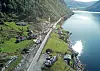 Dronefoto som viser veianlegget under utbygging, med Vik i Sogn i bakgrunnen.Foto: Statens vegvesen